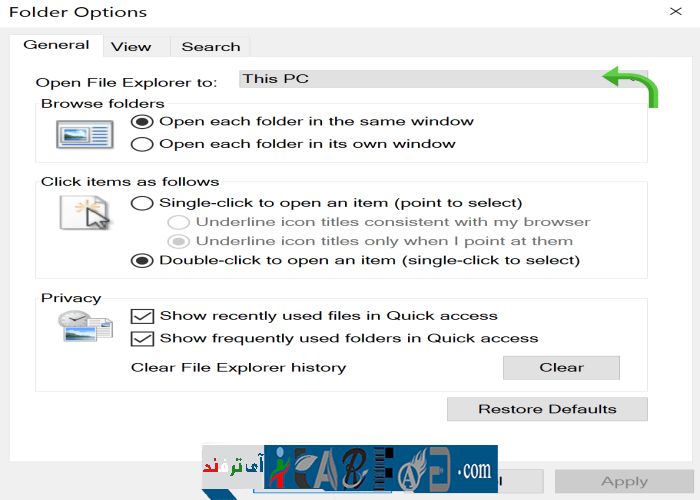 سپس گزینه This PC را از قسمت Open File Explorer To انتخاب کنید.