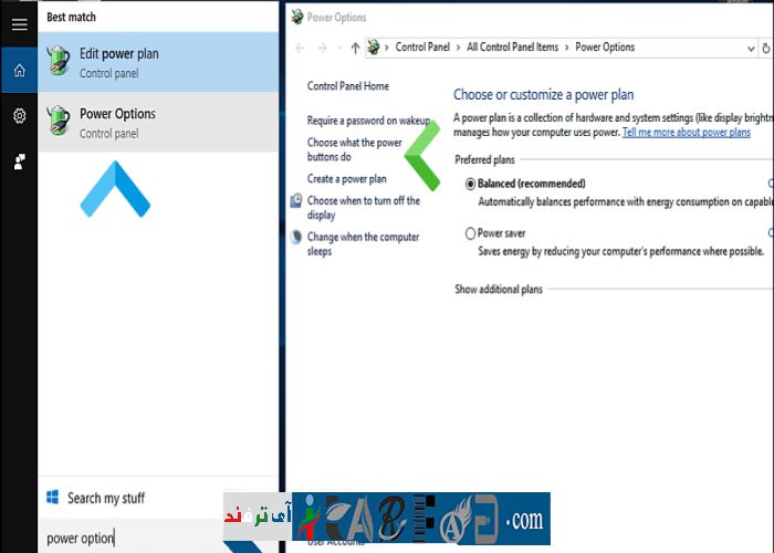 ابتدا جستجو ویندوز را باز کنید و کلمه Power Option را در آن بنویسید و سپس آن را اجرا کنید.