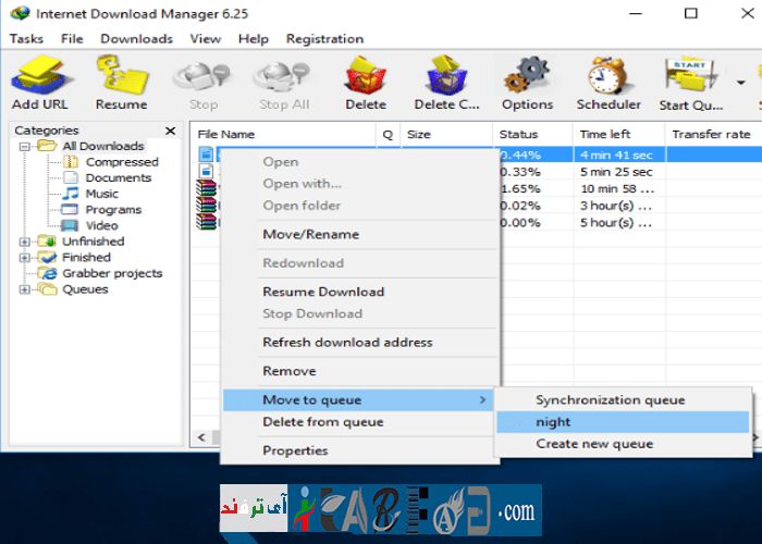 برای دانلود خودکار ابتدا باید یک گروه بسازید و فایل های خود را به آن منتقل کنید. برای این کار مانند عکس زیر عمل کنید و فایل هایی که می خواهید را انتخاب کرده و بر روی آن ها راست کلیک کنید و به گروهی که ساخته اید منتقل کنید و یا بر روی Create New Queue کلیک کنید و با نام دلخواه یک گروه بسازید.