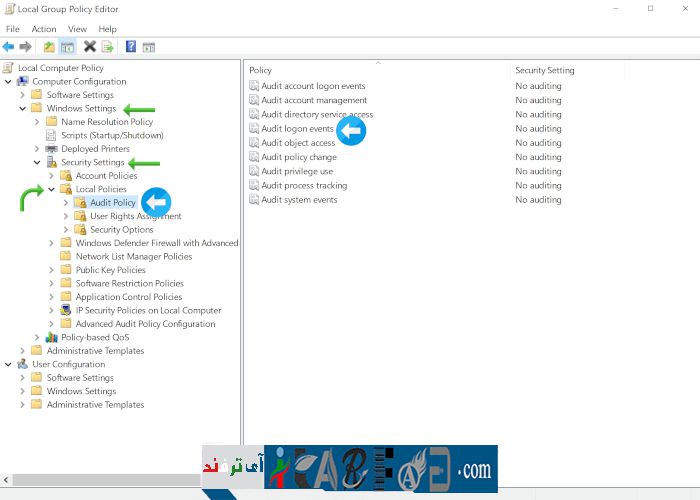 ابتدا کلمه gpedit.msc را در ویندوز خود جستجو کنید تا صفحه زیر باز شود و سپس مانند عکس گزینه Audit logon events را انتخاب کنید.