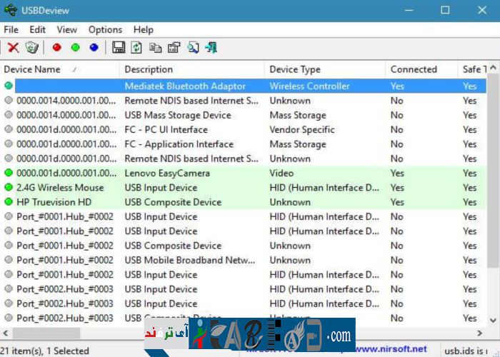 نرم افزار usbdeview لیست تمام وسیله های جانبی متصل شده به دستگاه شما را نمایش می دهد که با کلیک بر روی گزینه تاریخ می توانید آن ها را بر حسب آخرین زمان متصل شدن مرتب کنید.
