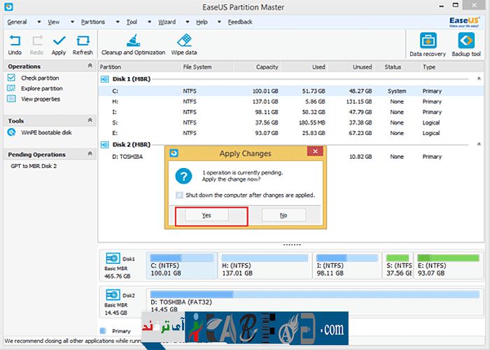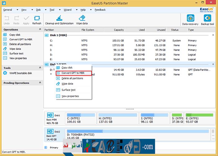 روش دوم ( بدون از دست رفتن اطلاعات ) توسط EaseUS Partition Master برای این روش نیاز به دو هارد در رایانه خود دارید تا نرم افزار EaseUS Partition Master را بر روی هارد دوم نصب کنید. بعد از اجرا نرم افزار بر روی هاردی که می خواهید سیستم پارتیشن آن را تغییر دهید راست کلیک کنید و گزینه مورد نظر را انتخاب کنید.