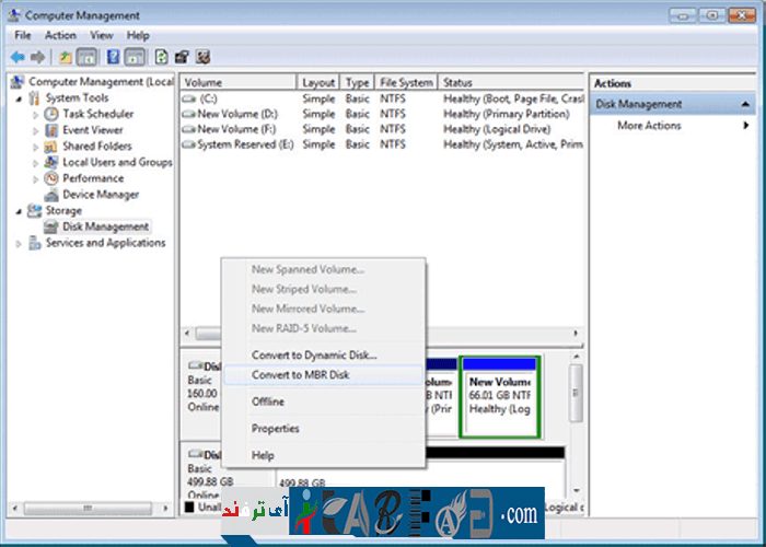 روش سوم ( با از دست رفتن اطلاعات ) بدون نرم افزار برای این کار بر روی My Computer راست کلیک کنید و گزینه Manage را انتخاب کنید. اکنون از سمت چپ و زیر مجموعه Storage گزینه Disk Management را انتخاب کنید. در این قسمت باید تمام پارتیشن های هارد مورد نظر را توسط گزینه Delete Volume در راست کلیک ، پاک کنید. بعد از این کار بر روی پارتیشن خالی باقیمانده راست کلیک کنید و گزینه Convert To MBR Disk را انتخاب کنید.