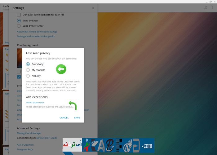 اکنون در این قسمت می توانید مشخص کنید که چه کسانی می توانند آخرین زمان بازدید شما را مشاهده کنند و یا افرادی را در مشخص کنید که نتوانند این زمان را مشاهده کنند.