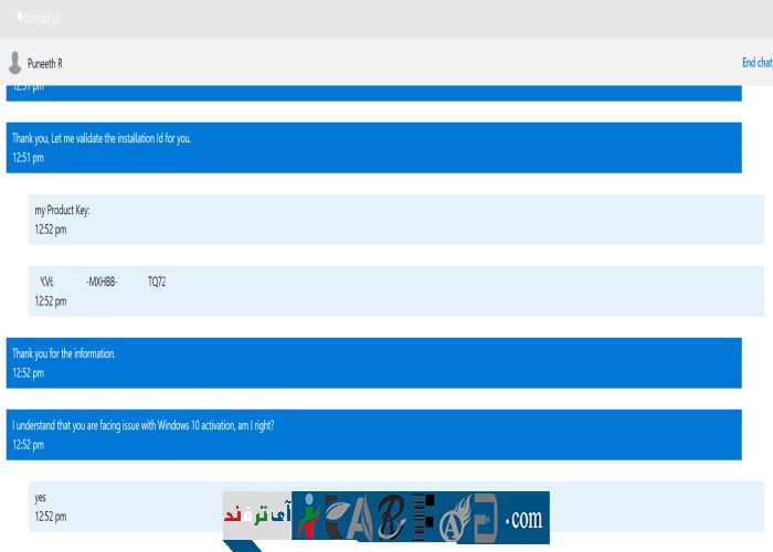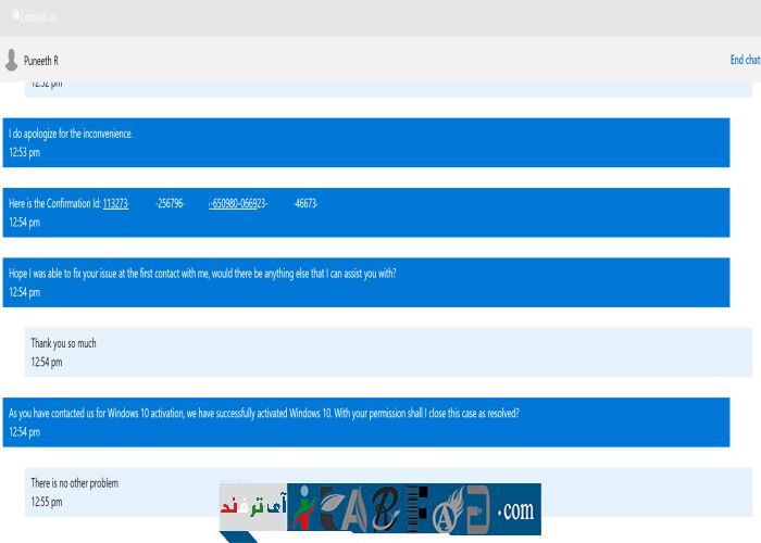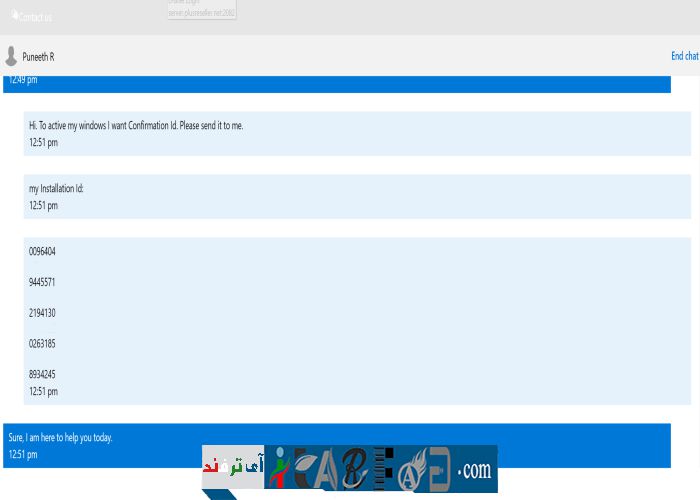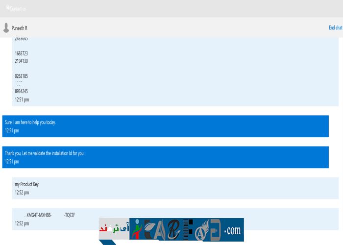 اکنون شما به یک فرد متصل می شوید که باید با دادن Installation ID و Product Key که از (این لینک) برداشته بودید ، از او بخواهید که Confirmation Id را به شما بدهد.