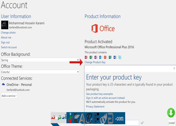 ابتدا به سربرگ File بروید و از سمت چپ Account را انتخاب کنید وسپس بر روی Change Product Key کلیک کنید و در بخش باز شده یکی از کدهای (این لینک) را با توجه به نوع آفیس خود وارد کنید و سپس بر روی Install کلیک کنید.