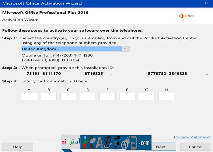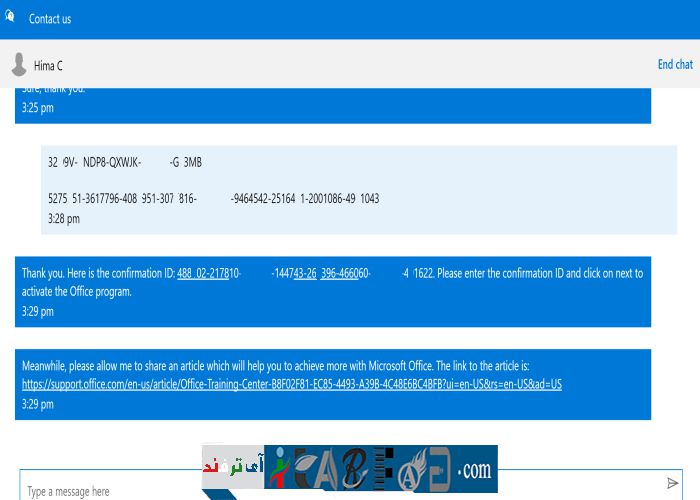 اکنون به (این لینک) بروید و بر روی Chat کلیک کنید. اکنون مانند فعال سازی ویندوز شما به یک پشتیبان متصل می شوید که با دادن Installation ID و Product Key از او بخواهید که Confirmation Id بدهد و این کد را در آفیس وارد کنید.