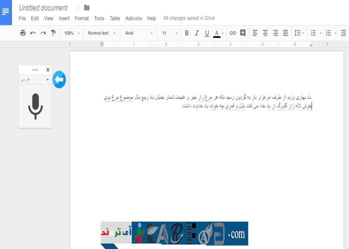 سپس زبان فارسی را انتخاب کنید و بر روی آیکون میکروفون کلیک کنید و سپس در پیغام نمایش داده شده بر روی Allow کلیک کنید تا دسترسی شنیدن صدا را به این سایت بدهید.