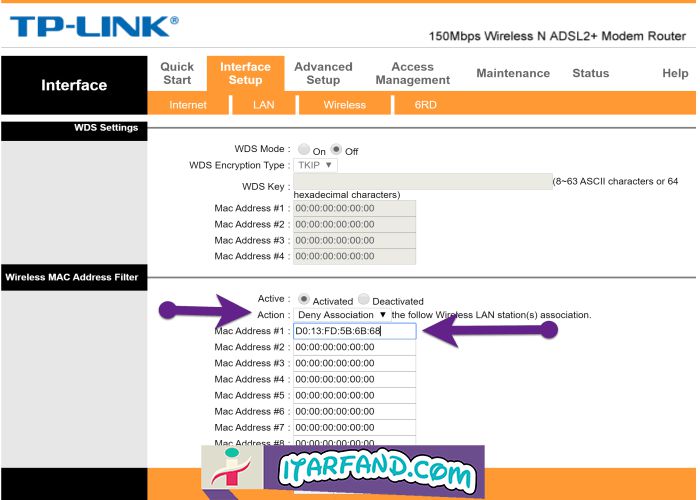 در این قسمت کافی است گزینه Active را انتخاب کنید و سپس مانند عکس زیر گزینه Deny Association را انتخاب کنید و افرادی که نمیخواید به اینترنت متصل شوند را در قسمت های پایین آن وارد کنید.