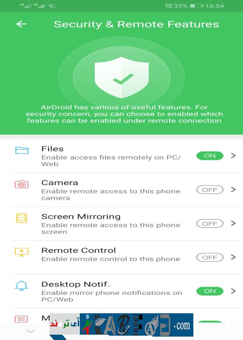 در صفحه بعد می توانید دسترسی های اپلیکیشن را مشخص کنید، در این قسمت دست شما بسیار باز می باشد که علاوه بر انتقال فایل ها می توانید Notification های موبایل را در لپ تاپ ببینید یا موبایل را از راه دور کنترل کنید، به دوربین دسترسی داشته باشید و یا صفحه موبایل را ببینید.