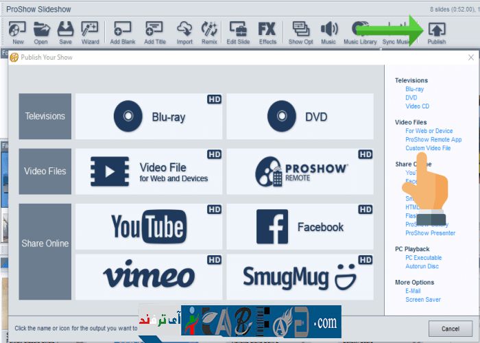 برای خروجی گرفتن از کلیپ ساخته شده گزینه Publish را از قسمت بالا انتخاب و سپس گزینه Custom Video File را انتخاب کنید.